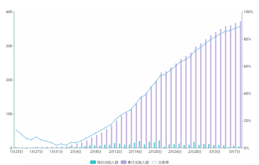 ▲目前,累計(jì)已出院373例,治愈率超過(guò)89%,高于全國(guó)(72.6%)16.4個(gè)百分點(diǎn)。