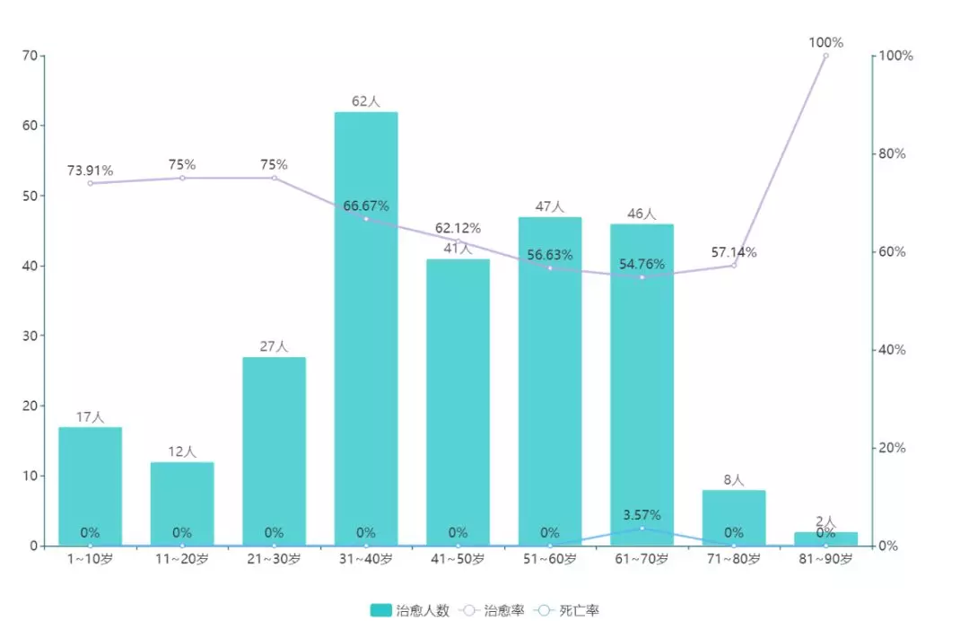 ▲各年齡段均有治愈病例,但從治愈率曲線可以看出,隨著年齡增加,治愈率有所下降,治療難度逐步上升。