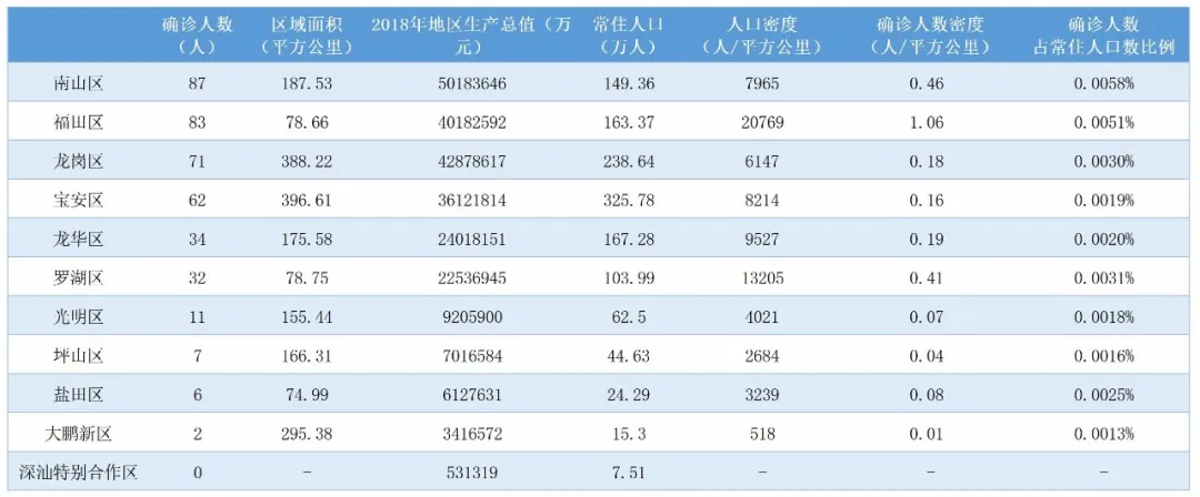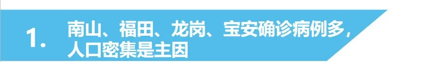 ▲很明顯,人口稠密地區(qū)確診病例較多,福田、南山、羅湖確診人數(shù)在單位面積中密度高;南山、福田兩區(qū)確診人數(shù)在總?cè)丝跀?shù)當(dāng)中占比高。
