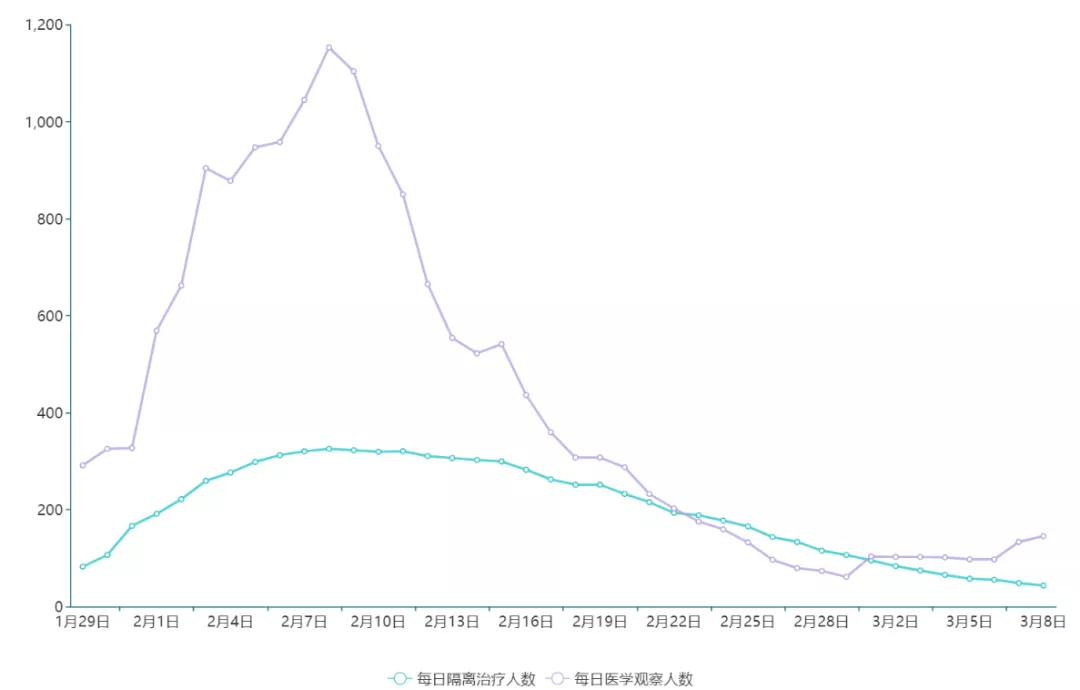 ▲自2月3日起,深圳每日都有新冠肺炎確診病例達(dá)到出院標(biāo)準(zhǔn),截至3月8日24時(shí),累計(jì)出院病例達(dá)到373例,治愈率達(dá)89%,高于全國(guó)72.6%的治愈率,治療方案取得明顯成效。另外,2月8日之后,每日醫(yī)學(xué)觀察人數(shù)保持低位并處于總體下行區(qū)間。