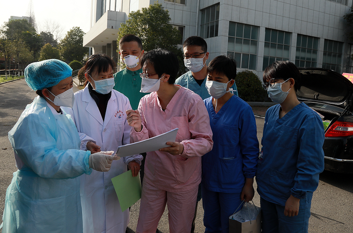 ▲深圳醫(yī)療隊(duì)員徐平(中)、范昭(后排右一)、王玲(右二)、徐佳卿(后排右二)、陳潔麗(右一)與監(jiān)利縣委黨校隔離點(diǎn)工作人員交流。