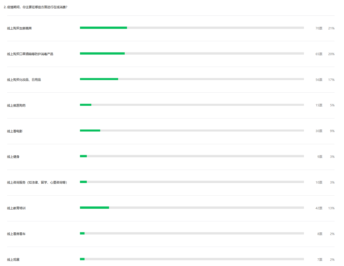 雖然有56%的市民表示對“在線消費(fèi)”的商品質(zhì)量和服務(wù)評價(jià)滿意度下降,但是市民的原有生活習(xí)慣卻在潛移默化中改變了,超一半的市民表示喜歡“在線消費(fèi)”,疫情結(jié)束后,會(huì)提高“在線消費(fèi)”在日常開銷中的比例。特別是會(huì)加強(qiáng)生鮮蔬菜、口罩酒精、化妝日用品的購買頻率,也會(huì)更常使用網(wǎng)絡(luò)進(jìn)行教育培訓(xùn)、就醫(yī)購藥、法律咨詢、看房看車等。