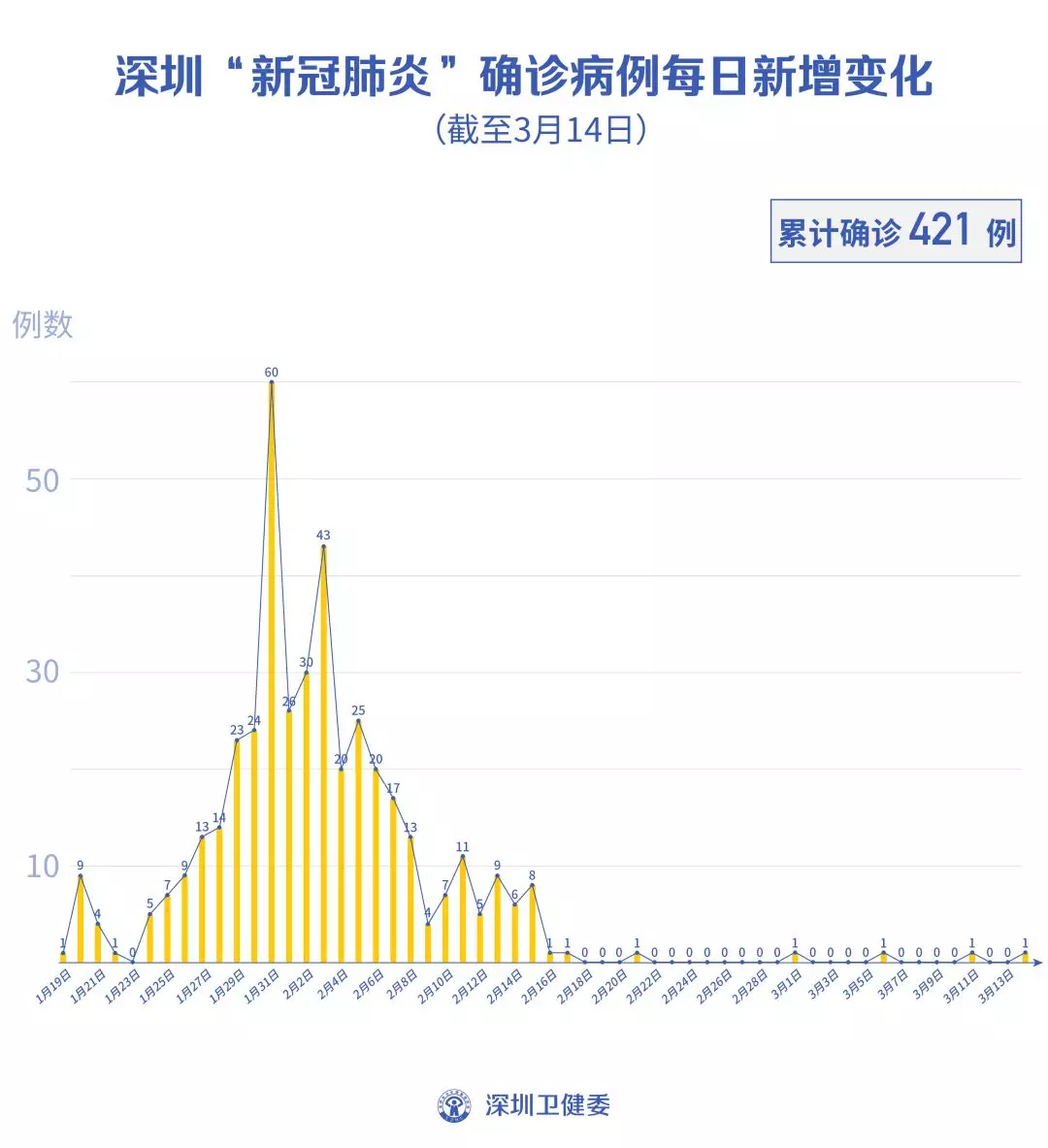 截至3月14日24時,深圳累計報告“新冠肺炎”確診病例421例。3月14日當天新增1例,出院3例。