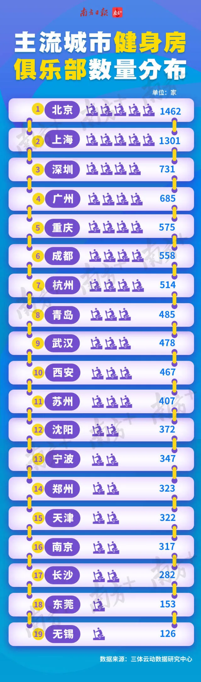 南方經(jīng)濟(jì)智庫梳理三體云動(dòng)數(shù)據(jù)研究中心《2018中國健身行業(yè)數(shù)據(jù)報(bào)告》的數(shù)據(jù)發(fā)現(xiàn),北上廣深城市健身房數(shù)量領(lǐng)跑全國,深圳、廣州分列第三和第四。前19名均為經(jīng)濟(jì)發(fā)達(dá)城市或主要省會(huì)城市。