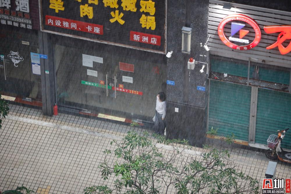 福田新洲村,一位沒帶傘的市民在屋檐下躲雨。