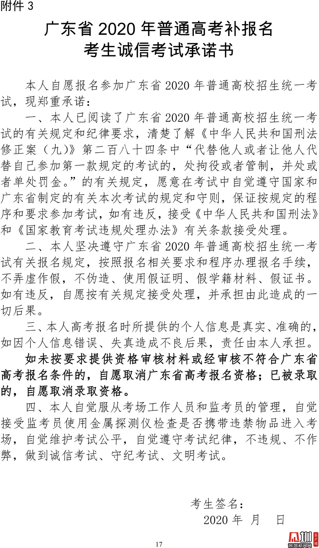 見圳客戶端·深圳新聞網(wǎng)2020年3月19日訊(見圳客戶端、深圳新聞網(wǎng)記者 金洪竹)3月18日,記者從廣東省招生委員會辦公室獲悉,為滿足退伍軍人、運動訓(xùn)練及武術(shù)與民族傳統(tǒng)體育考生、高職院校自主招生考生等符合我省高考條件,因各種原因尚未參加高考報名人員的需求,經(jīng)研究決定安排一次高考補(bǔ)報名,補(bǔ)報名時間為3月23-26日。同時,為確??忌涂荚嚬ぷ魅藛T的生命安全和身體健康,減少聚集,本次高考補(bǔ)報名采取先線上辦理、后補(bǔ)驗材料的方式進(jìn)行。