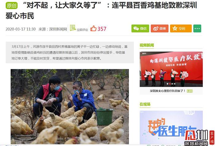 深圳新聞網(wǎng)愛心助農(nóng)的報(bào)道推出后,得到深圳各界和愛心市民的踴躍參與,大家紛紛通過報(bào)道中公布的微店訂購(gòu)愛心雞。突然猛增的訂單,讓連平農(nóng)民感動(dòng)的同時(shí),也倍感壓力,因?yàn)榘傧汶u都是現(xiàn)殺現(xiàn)寄,全程冷鏈配送,所以導(dǎo)致有些訂單滯后。3月17日,連平農(nóng)戶還通過深圳新聞網(wǎng)向深圳愛心市民發(fā)出致歉信--《“對(duì)不起,讓大家久等了”:連平縣百香雞基地致歉深圳愛心市民》,通過深圳新聞網(wǎng)向深圳愛心市民表示謝意的同時(shí),又表達(dá)歉意。