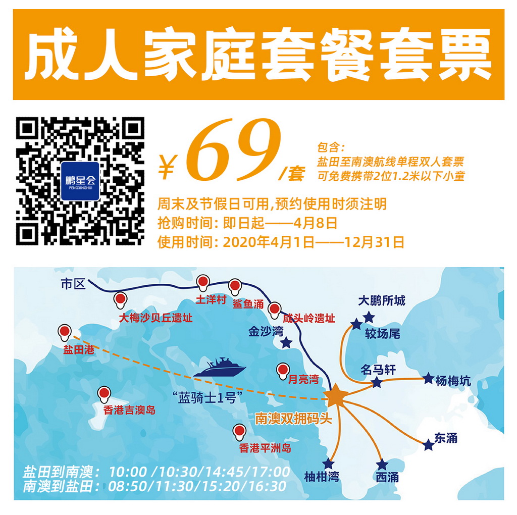 此外,即日起至4月8日,“鵬星會”專門推出69元“鹽田-南澳”航線家庭套票特價套餐搶購活動,套餐包含2位成人(可免費攜帶2位身高1.2米以下小童)全航班單程船票,有效期為2020年4月1日至12月31日,周末及節(jié)假日均可使用,市民及旅客朋友可通過“鵬星會”公眾號下單搶購,搶購成功后,在出發(fā)前需至少提前1天以上致電4001020860預約,該套餐不接受出發(fā)當天預約。