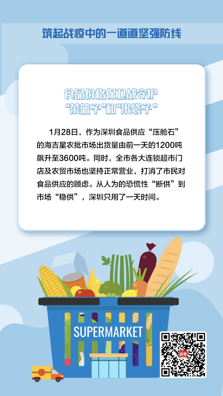 “食品價(jià)格保衛(wèi)戰(zhàn)”第一槍在1月27日打響。當(dāng)天,市菜籃子工程領(lǐng)導(dǎo)小組召集各大商超市場(chǎng)責(zé)任人開會(huì),制定詳細(xì)的作戰(zhàn)計(jì)劃。1月28日,作為深圳食品供應(yīng)“壓艙石”的海吉星農(nóng)批市場(chǎng)出貨量由前一天的1200噸飆升至3600噸。同時(shí),全市各大連鎖超市門店及農(nóng)貿(mào)市場(chǎng)也堅(jiān)持正常營(yíng)業(yè),打消了市民對(duì)食品供應(yīng)的顧慮。從人為的恐慌性“斷供”到市場(chǎng)“穩(wěn)供”,深圳只用了一天時(shí)間。