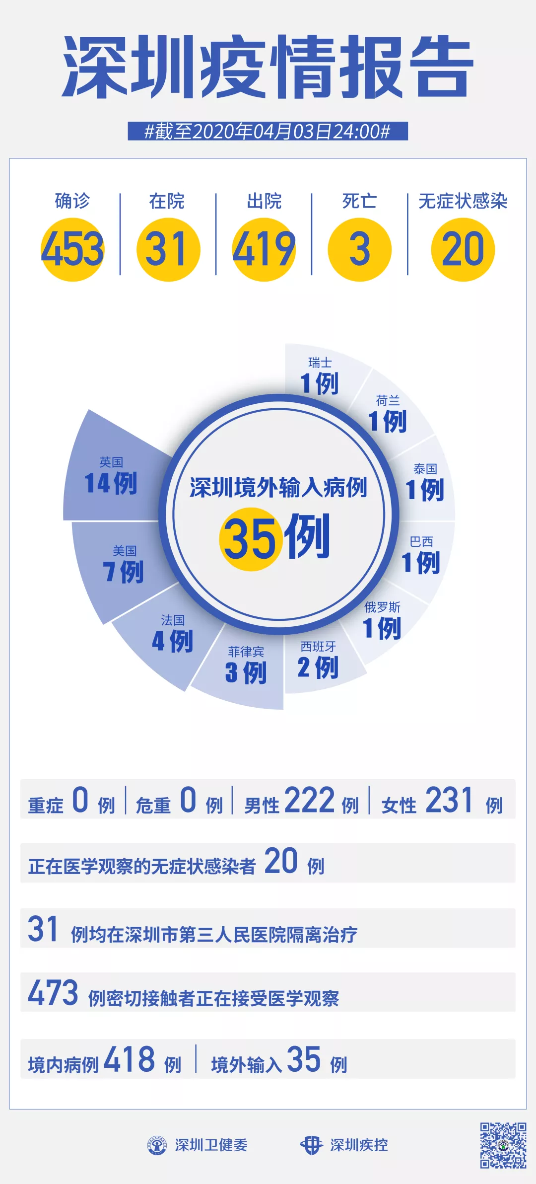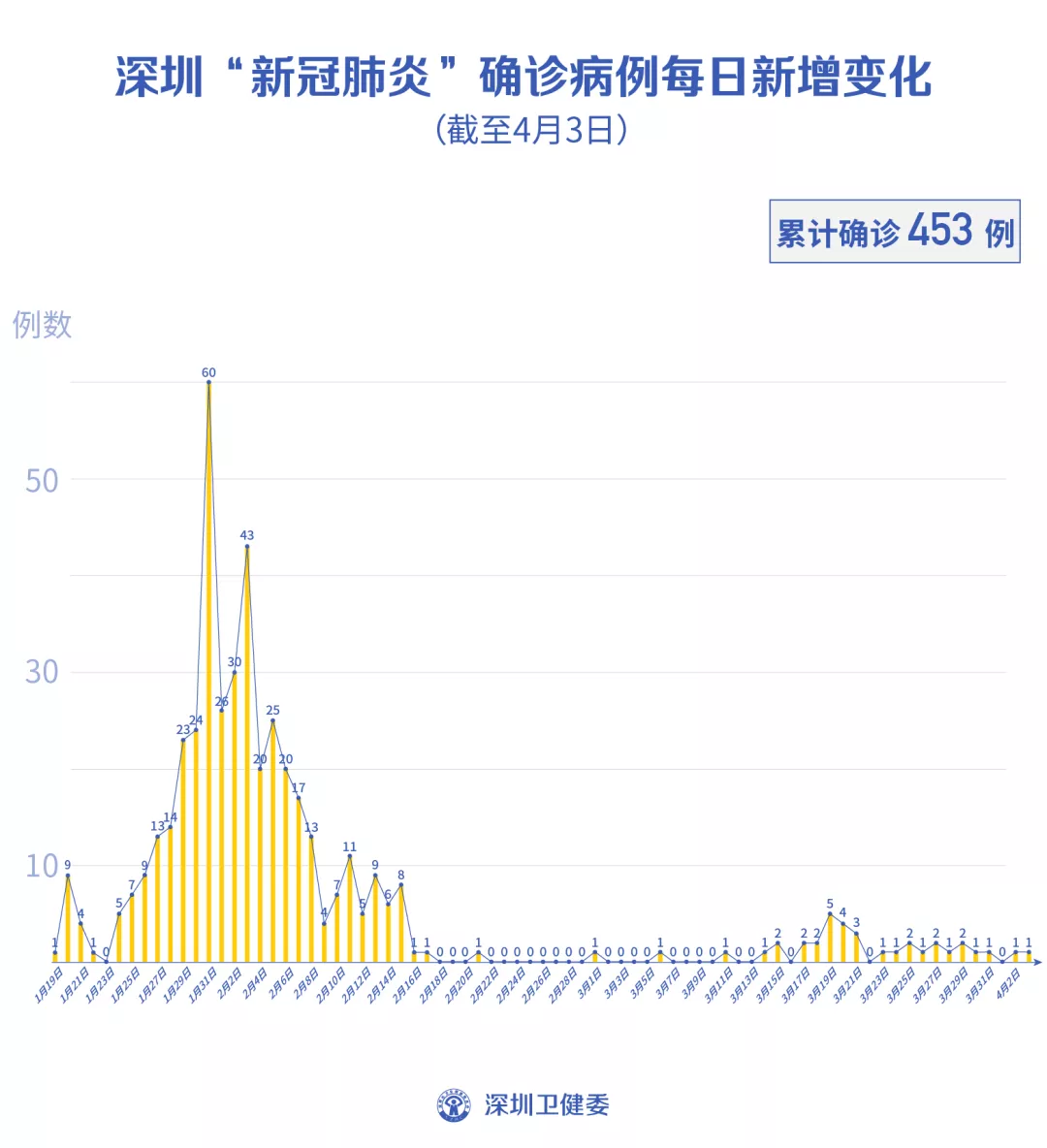 截至4月3日24時,深圳累計報告新冠肺炎病例453例。4月3日當(dāng)天新增1例境外輸入病例。