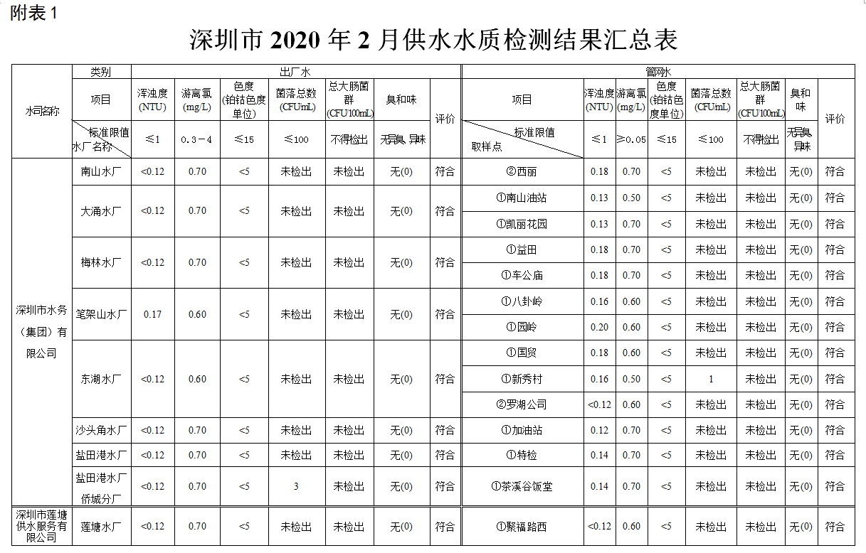 見圳客戶端·深圳新聞網(wǎng)2020年4月4日訊(見圳客戶端、深圳新聞網(wǎng)記者葉梅)2020年2月,深圳市水務(wù)局對(duì)全市42個(gè)水廠出廠水水樣以及68個(gè)管網(wǎng)水水樣進(jìn)行了抽檢。檢測(cè)結(jié)果表明,依據(jù)GB5749—2006《生活飲用水衛(wèi)生標(biāo)準(zhǔn)》,所有受檢42個(gè)出廠水水樣和68個(gè)管網(wǎng)水水樣的渾濁度、消毒劑(游離氯或二氧化氯或總氯)、色度、菌落總數(shù)、總大腸菌群及臭和味共6項(xiàng)常規(guī)指標(biāo)全部符合該標(biāo)準(zhǔn)的規(guī)定,出廠水水樣合格率為100%,管網(wǎng)水合格率為100%。