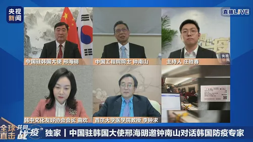 4月10日15時(shí),中國駐韓國大使邢海明邀請(qǐng)鐘南山院士與韓國防疫專家李鐘求教授在線交流。鐘南山專門制作了一個(gè)題為“抗擊新冠肺炎的中國經(jīng)驗(yàn)”的PPT,向韓國朋友介紹中國經(jīng)驗(yàn)。