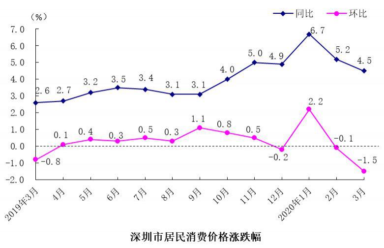 深圳特區(qū)報2020年4月12日訊 4月12日,國家統(tǒng)計局深圳調(diào)查隊發(fā)布最新統(tǒng)計數(shù)據(jù),3月份,深圳居民消費價格(CPI)環(huán)比下降1.5 %,降幅比上月擴(kuò)大1.4個百分點;CPI同比上漲4.5%,漲幅比上月收窄0.7個百分點。