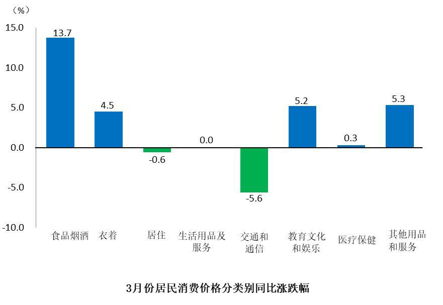 八大類商品和服務(wù)同比價格五升二降一平,食品煙酒價格上漲13.7%,其他用品和服務(wù)價格上漲5.3%,教育文化和娛樂價格上漲5.2%,衣著價格上漲4.5%,醫(yī)療保健價格上漲0.3%;交通和通信價格下降5.6%,居住價格下降0.6%;生活用品及服務(wù)價格持平。