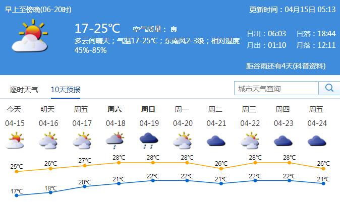 16-17日多云,氣溫繼續(xù)回升,中午前后較熱;18-19日有陣雨或雷雨。全市森林火險黃色預(yù)警信號仍在生效中,需注意用火安全,防范火災(zāi)發(fā)生。