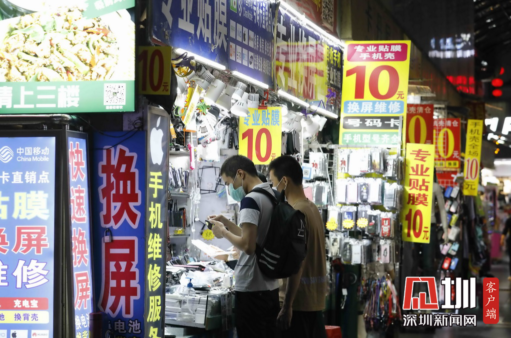 東門步行街的手機配件門店前,兩位市民正在選購。