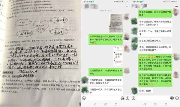 疫情來的迅猛又猝不及防,老師們一方面要完成教學(xué)任務(wù)、引導(dǎo)學(xué)生做好防疫,一方面要時(shí)刻關(guān)注學(xué)生的心理健康。學(xué)生們被迫在家度過了一個(gè)史上最長的寒假,對(duì)于處在叛逆期的孩子們來說,難免會(huì)與家人出現(xiàn)一些矛盾,在課堂之外,老師們還需要擔(dān)任“心理調(diào)節(jié)師”的角色。一次,周老師班上有個(gè)同學(xué)因?yàn)樯暇W(wǎng)課的事情與父母鬧了矛盾,一氣之下跑到奶奶家,周老師得知了這件事情,第一時(shí)間聯(lián)系上學(xué)生,通過鼓勵(lì)、引導(dǎo),讓學(xué)生認(rèn)識(shí)到自己的錯(cuò)誤,與父母和解。還有一次,周老師通過批改作業(yè),發(fā)現(xiàn)一名學(xué)生在作業(yè)中吐露了自己孤獨(dú)、無趣的心聲。看到后,周老師立刻與家長溝通了解情況,并建議家長多多陪伴孩子。盡管老師和學(xué)生們不能在學(xué)校的課堂上相聚,但在通訊十分發(fā)達(dá)的現(xiàn)在,老師們也始終用自己的方式陪伴在學(xué)生左右。