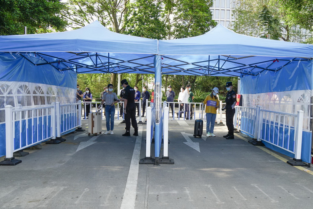 帶行李箱的學生走專用通道,依次完成掃碼核驗、測量體溫等流程后進入校園。