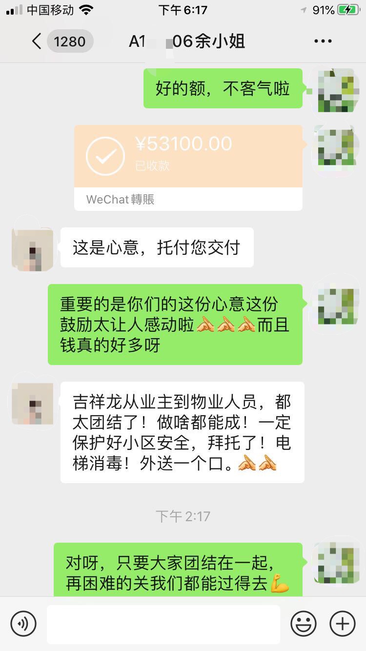 一天下來,吉祥龍小區(qū)共有156位愛心業(yè)主通過線上籌集款項53100元,最后以微信轉賬的形式轉給了吉祥龍小區(qū)服務中心負責人張經(jīng)理,并委托其轉交給堅守在工作崗位的每一位物業(yè)員工手中。