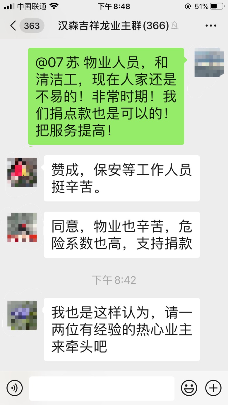 原來,吉祥龍小區(qū)業(yè)主因為覺得物業(yè)一線工作人員抗戰(zhàn)疫情工作危險又更辛苦,便在微信群內發(fā)起了給本小區(qū)物業(yè)人員捐款的倡議,收到了眾多業(yè)主的熱烈反響?!百澇?,保安等工作人員挺辛苦”、“同意,物業(yè)也辛苦,危險系數(shù)也高,支持捐款”……業(yè)主們通過討論,約定好捐贈方式全憑自愿、不搞強制、不論數(shù)額、謹表心意。短短一小時,捐贈金額就達到了3萬余元。業(yè)主余小姐表示,吉祥龍小區(qū)業(yè)主和物業(yè)人員在防疫過程中正團結一心、關系緊密,一定能保護好小區(qū)安全。