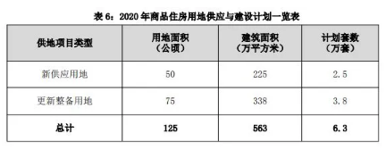 從商品住房用地安排來看,2020年度計劃安排商品住房用地供應125公頃,包括新供應用地50公頃,更新整備用地75公頃。同時,計劃共計擬建設擬建設商品住房6.3萬套、建筑面積563萬平方米。其中新供應用地擬建設2.5萬套、建筑面積約225萬平方米;更新整備用地擬建設3.8萬套、建筑面積約338萬平方米。