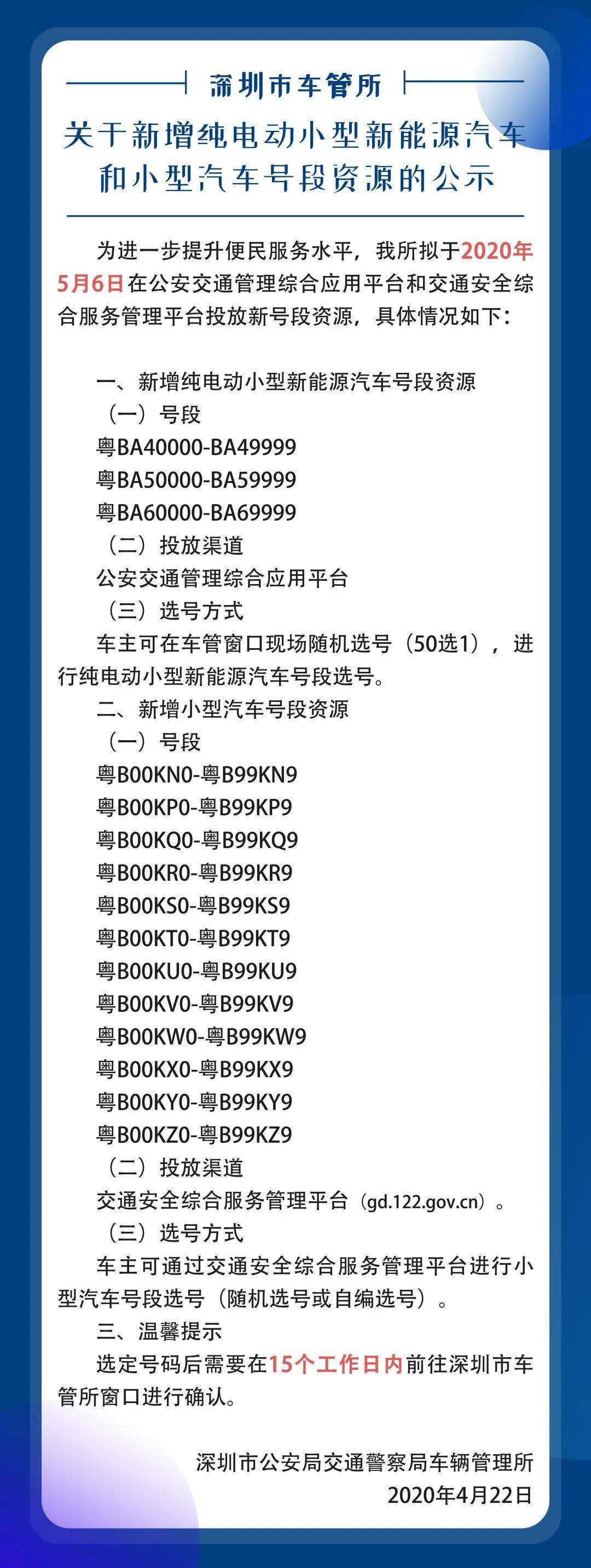 2020年4月23日訊 為進一步提升便民服務水平,深圳市車管所擬于2020年5月6日在公安交通管理綜合應用平臺和交通安全綜合服務管理平臺投放新號段資源。具體情況如下: