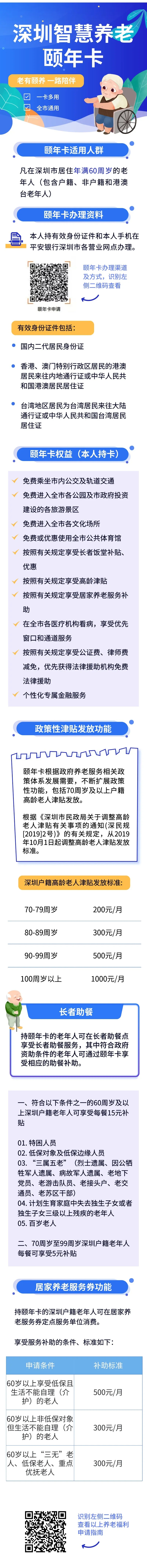 據(jù)悉,凡在深圳市居住年滿60周歲以上的老年人(包含港澳臺老年人),均可持有效身份證件和手機(jī)申請辦理。“頤年卡”持卡人,可享受敬老優(yōu)待,包括免費(fèi)進(jìn)入全市各公園,免費(fèi)進(jìn)入市政府投資建設(shè)各旅游景區(qū),免費(fèi)乘坐市內(nèi)公交車和軌道交通。70周歲及以上戶籍老人還可享受高齡津貼發(fā)放;符合規(guī)定的戶籍老年人可享受居家養(yǎng)老消費(fèi)的優(yōu)惠和補(bǔ)貼,包括:生活照料、家政服務(wù)、康復(fù)護(hù)理服務(wù)、日托服務(wù)、心理咨詢等。