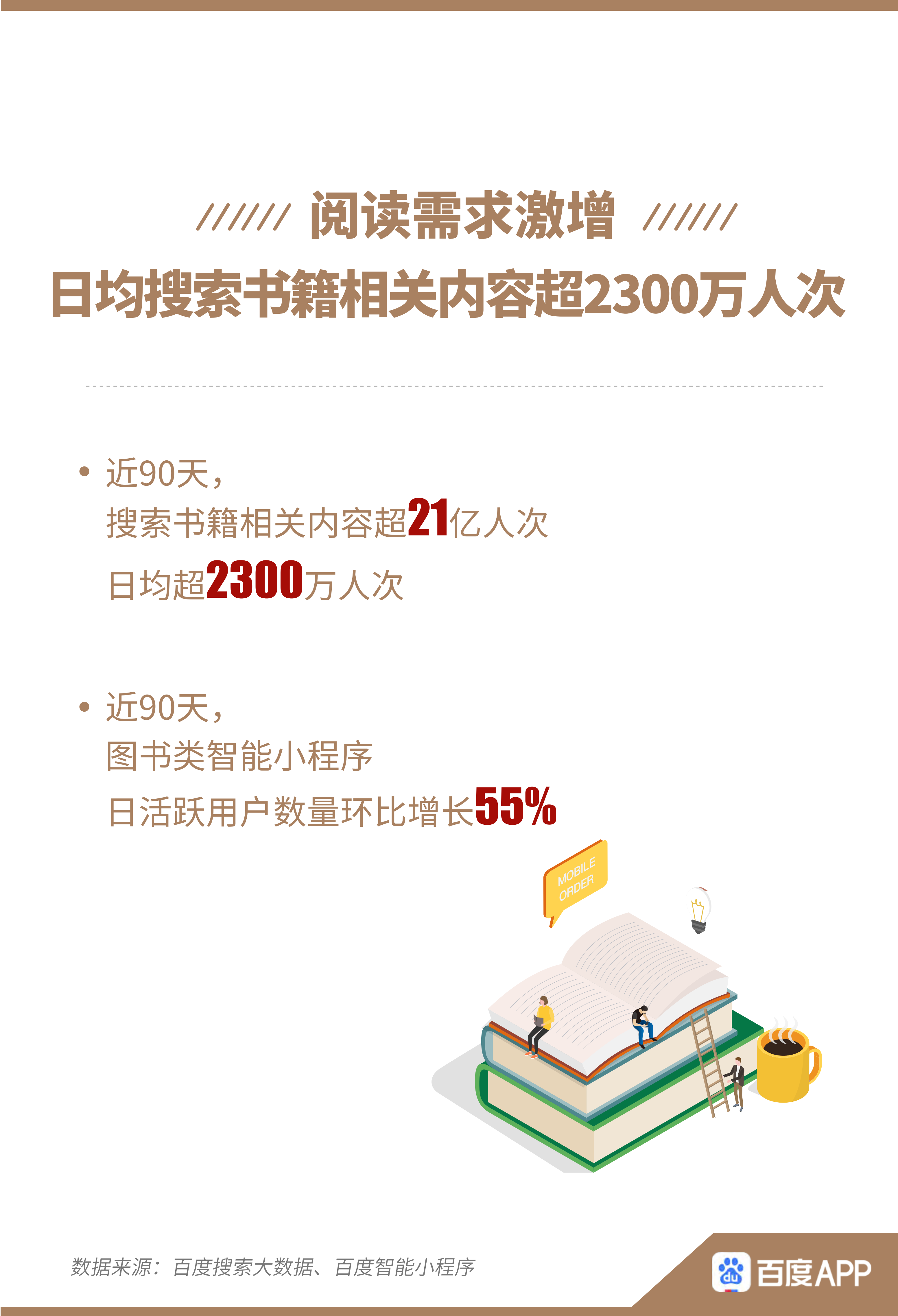 近日,百度APP聯(lián)合人民日?qǐng)?bào)數(shù)字傳播《有數(shù)青年》工作室發(fā)布的《百度全民讀書搜索大數(shù)據(jù)報(bào)告》(以下簡(jiǎn)稱“報(bào)告”)顯示,疫情宅家使網(wǎng)友閱讀需求激增,近90天,日均超2300萬人次在百度搜索書籍相關(guān)內(nèi)容,累計(jì)超21億人次,圖書類智能小程序日活躍用戶環(huán)比增長(zhǎng)55%,讀書、購(gòu)書線上化再進(jìn)一步。