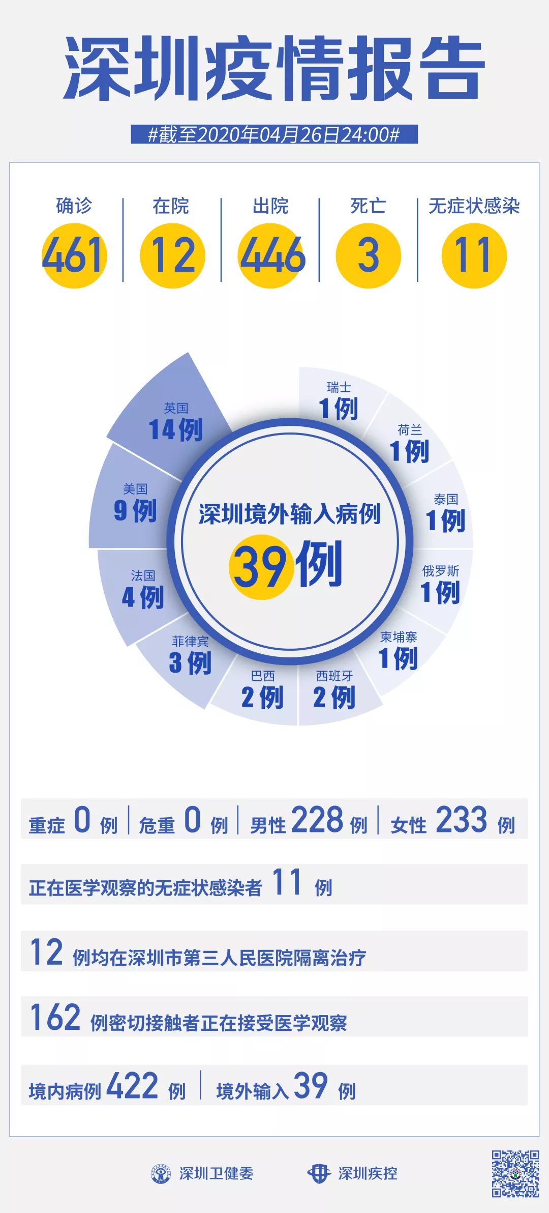 截至4月26日24時,深圳累計(jì)報告新冠肺炎病例461例。