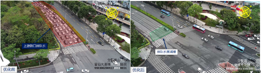 針對此情況,深圳交警對該路口綠信比方案進(jìn)行優(yōu)化調(diào)整,延長西面放行時間,同時壓縮北面和東面放行時間。優(yōu)化后,路口晚高峰持續(xù)時間縮短17.6%,南進(jìn)口車輛通行效率提升明顯,路口其余方向車輛排隊無明顯增加。