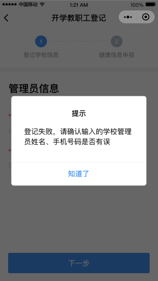②點(diǎn)擊“馬上登記”按鈕,填寫學(xué)校管理員姓名和手機(jī)號(hào)碼(學(xué)校管理員姓名和手機(jī)號(hào)碼請(qǐng)?jiān)儐枌W(xué)校獲得)后點(diǎn)擊“下一步”,然后選擇對(duì)應(yīng)的學(xué)校。