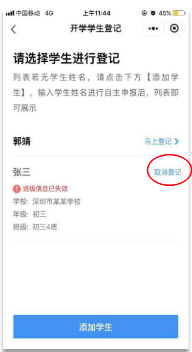 對(duì)于已完成開學(xué)登記的師生,如開學(xué)登記頁面顯示學(xué)校信息或班級(jí)信息已失效,或選錯(cuò)登記人員時(shí),請(qǐng)取消此條登記記錄,重新進(jìn)行開學(xué)登記。取消成功后,原申報(bào)的師生健康卡信息將會(huì)失效。以下操作步驟以學(xué)生登記為例,具體如下: