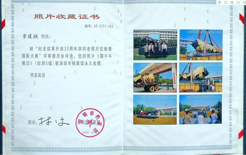 “一開始,我提出這個遷移建議時,還是有點忐忑的,后來得知‘孺子?!袼軐⒁浦潦形笤和夂?,我非常高興,這樣一來,跟‘孺子?!嫌熬头奖愣嗔搜?!”“孺子牛”雕塑遷移當天,韋建誠興奮地拿起相機,用鏡頭定格下整個搬遷過程?!澳且惶焓俏胰松铍y忘的日子之一,既是我44歲生日,又是‘孺子?!袼馨残录抑铡!被貞浧甬敃r的情況,韋建誠還是十分興奮。而韋建誠拍攝的組照后來被深圳市檔案館永久收藏。深圳市委辦公廳還將《市民希望將“孺子?!钡袼芤浦潦懈笤和狻吩u為一等獎。