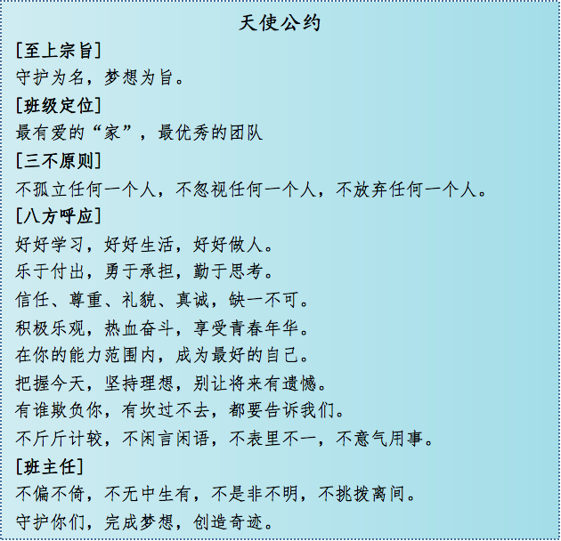 詹老師所帶班級嚴(yán)格遵守著“公約精神”,創(chuàng)造了一個個驚喜:2015級14班在藝術(shù)季班級文化設(shè)計(jì)中是全校唯一全員參與的班級;2016級8班在跳繩比賽中從練習(xí)時的倒數(shù)第一到復(fù)賽逆襲闖進(jìn)決賽獲得一等獎;2017級9班在疫情網(wǎng)課期間堅(jiān)持每科作業(yè)“今日事今日畢”,無一人掉隊(duì)。