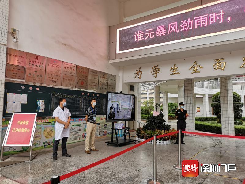 “同學(xué)們好!”“歡迎回來!”從7點起,明德實驗學(xué)校校長魯江與工作人員就在香蜜校區(qū)校門口迎候?qū)W生們,提醒孩子們戴好口罩,也與家長們交流返校事宜。校門口的一臺超氧水消殺機器人也在積極投入工作,工作人員在后臺控制面板可以監(jiān)測到入校人員的體溫情況。