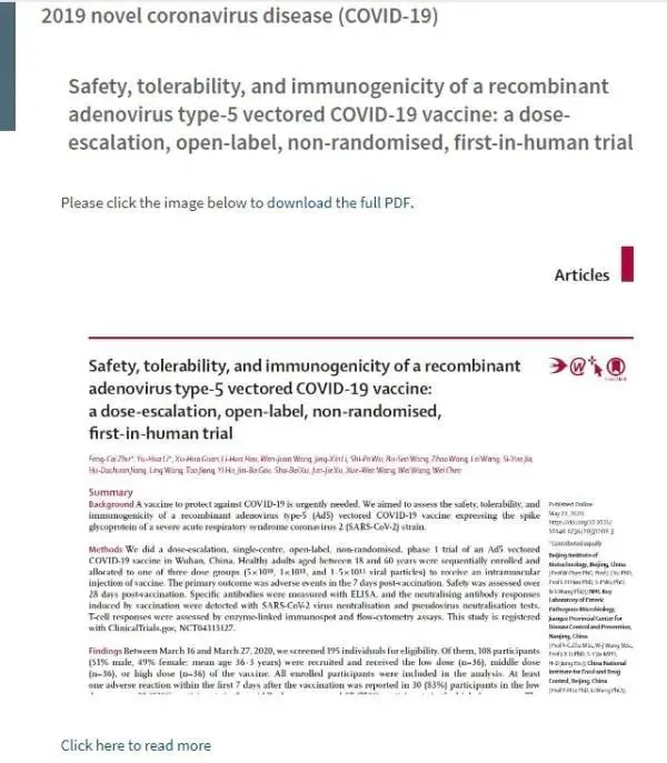 柳葉刀發(fā)布陳薇團(tuán)隊(duì)疫苗試驗(yàn)結(jié)果: