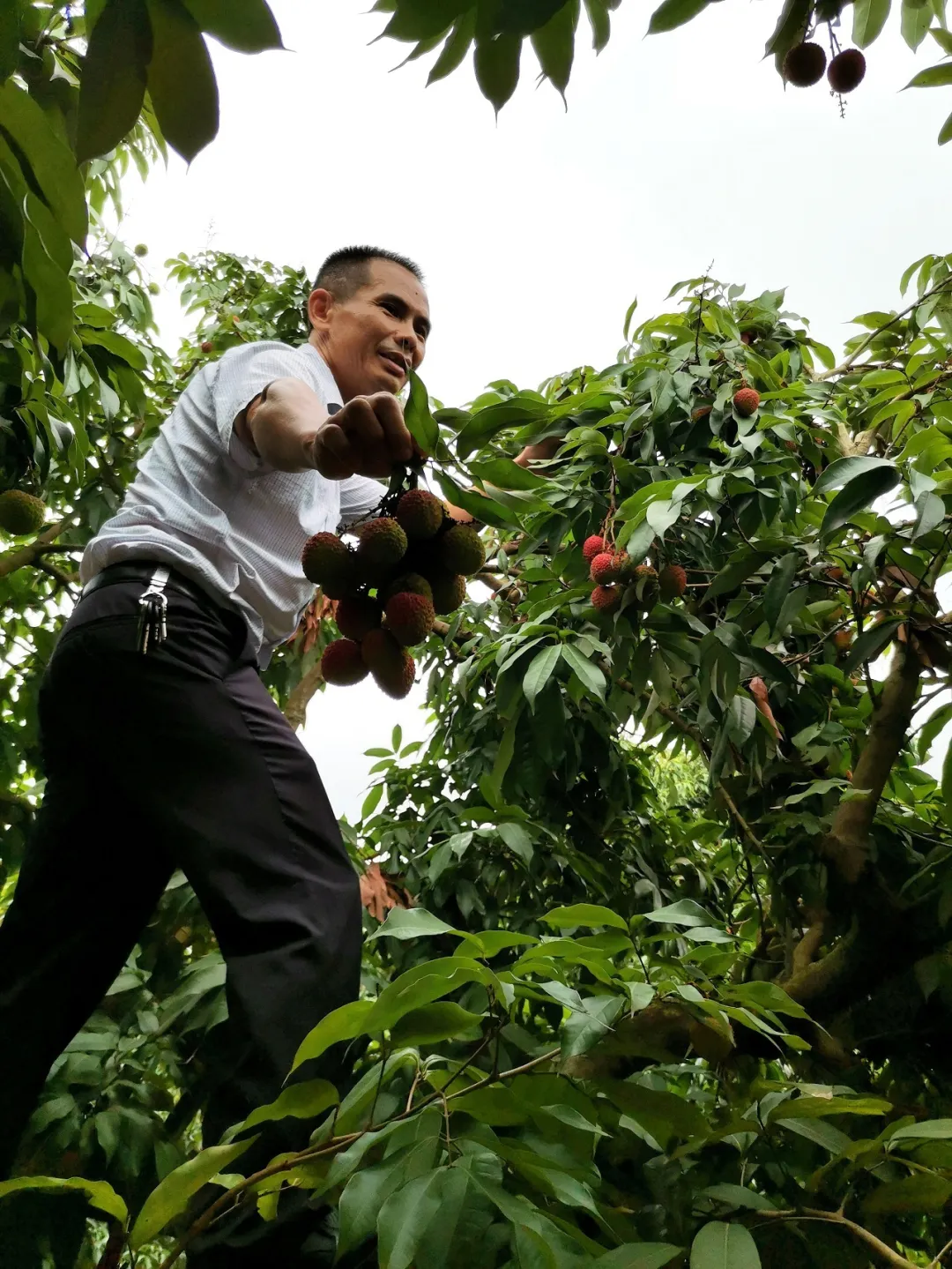 5月28日,西麗果場(chǎng)的種養(yǎng)專家邱金淡一早來到園區(qū),開展病蟲防治,清理荔枝樹上破裂的荔枝。前幾日,一場(chǎng)猛烈的龍舟雨,讓長(zhǎng)勢(shì)正旺的糯米糍遭受當(dāng)頭一擊,不少爆漿裂果。邱金淡在南山種植荔枝20多年,對(duì)各種“天災(zāi)意外”波瀾不驚,談起今年的收成,他苦笑著說,“種植就是看老天爺吃飯”。受雨水影響,糯米糍、桂味減產(chǎn)明顯。早熟品種妃子笑受影響較小,已由青轉(zhuǎn)紅成熟,開始陸續(xù)上市。