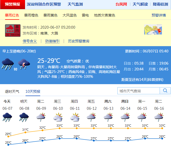 【06-07 08:12】過去3小時,鹽田區(qū)和葵涌街道累計雨量已達大暴雨,預計強降雨還將持續(xù)2小時,深圳市氣象臺于2020年06月07日08時10分在鹽田區(qū)和葵涌街道發(fā)布暴雨紅色分區(qū)預警,全市處于暴雨緊急防御狀態(tài),托兒所、幼兒園和中小學停課