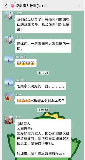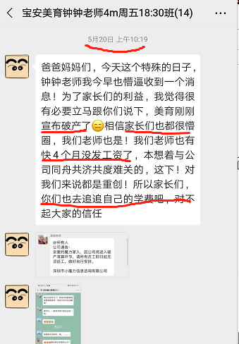 一名丁姓家長介紹,5月20日,家長接到美育老師消息,稱公司剛剛宣布破產(chǎn),老師工資被拖欠4個(gè)月。家長介紹,老師曝光該消息后,培訓(xùn)機(jī)構(gòu)支付了他們的拖欠工資。隨后大量老師離職。