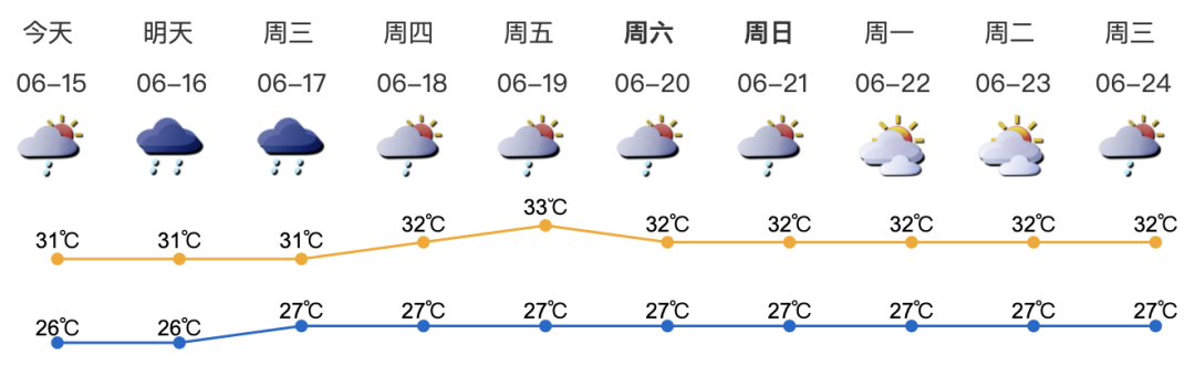 我市多云,有(雷)陣雨,部分時間雨勢較大;氣溫26-31℃;南風(fēng)3級,陣風(fēng)6級;相對濕度75%-95%。
