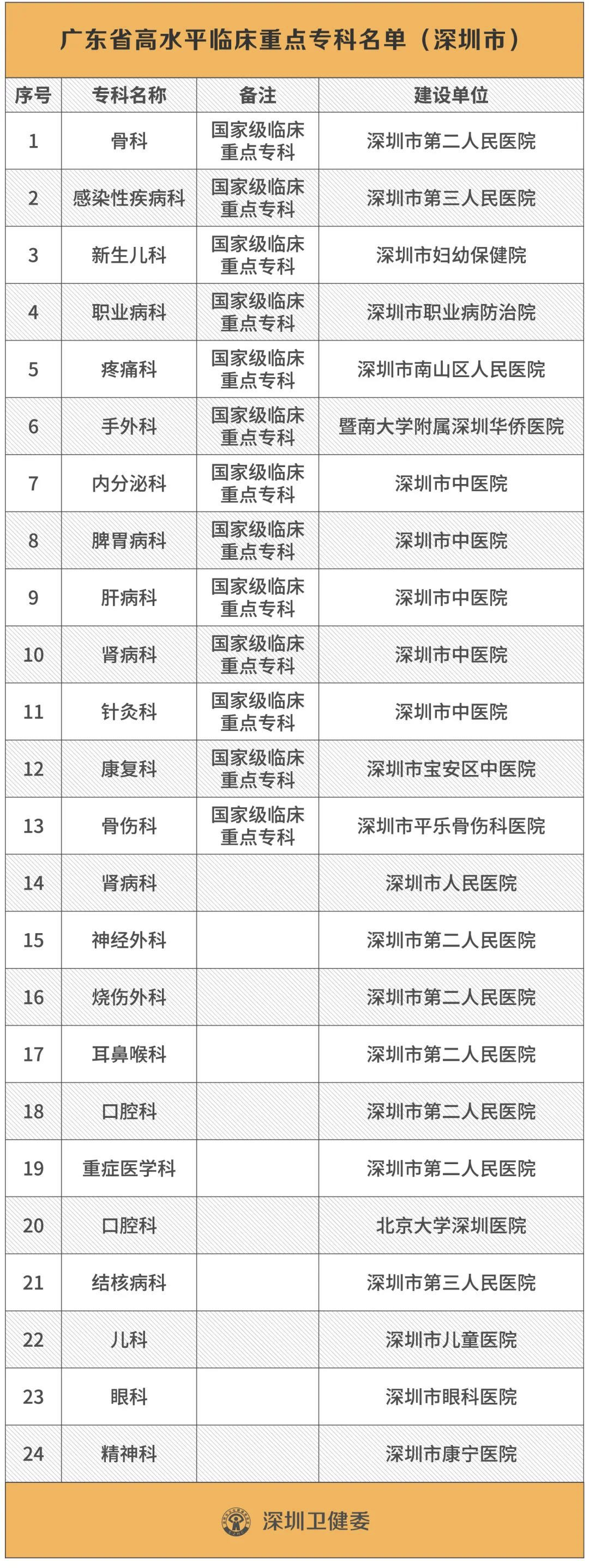 那是因為它們在另一份“省重點”名單上。這就是2019年由廣東省衛(wèi)健委公布的“廣東省高水平臨床重點??啤泵麊?。深圳一共有24個??迫脒x,其中13個是國家衛(wèi)健委或國家中醫(yī)藥管理局認定的國家級臨床重點???。