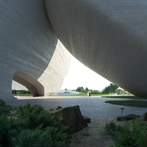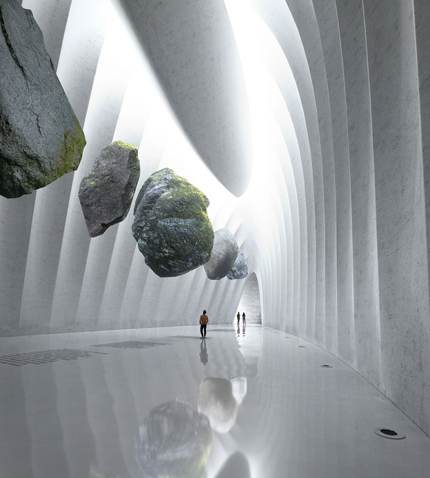 MAD的方案將較大體量的標(biāo)準(zhǔn)展覽空間、公共教育場地、圖書館、接待大堂、咖啡廳、配套商業(yè)等功能放置在首層并覆土,屋頂形成綠地與城市直接連接,構(gòu)成這個區(qū)域面積最大的公園。順應(yīng)建筑的曲線,屋頂坡度自然發(fā)展,柔和回落大地,接壤之處設(shè)計(jì)成數(shù)個下沉庭院,高低相合,延綿不斷。