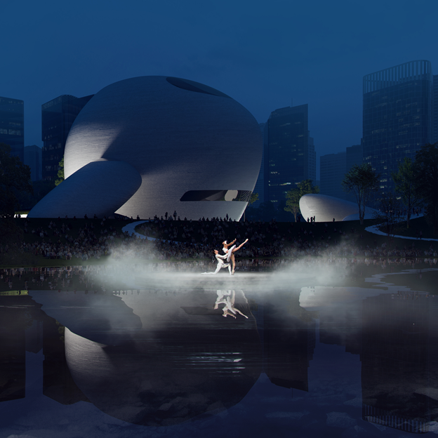 廣場中央的水池,可以作為劇場,容納萬人活動;景觀中預(yù)留出多處平臺,提供公共藝術(shù)展覽、市集、藝術(shù)節(jié)、音樂節(jié)等戶外活動場地;公園將城市的中軸線延續(xù)到海邊,行人步道、自行車道蜿蜒穿梭在建筑和草坪之間,為市民提供海濱休閑場地。
