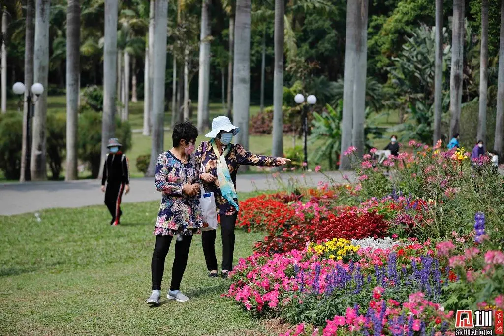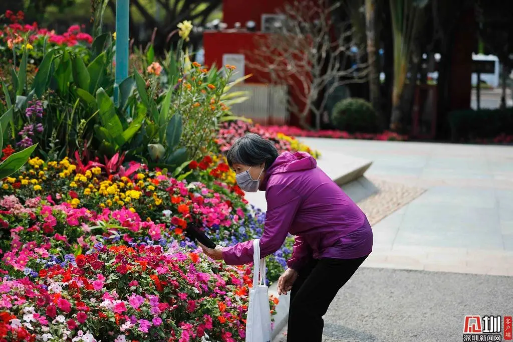 蓮花山公園入口處的鮮花吸引了兩位市民駐足觀看。