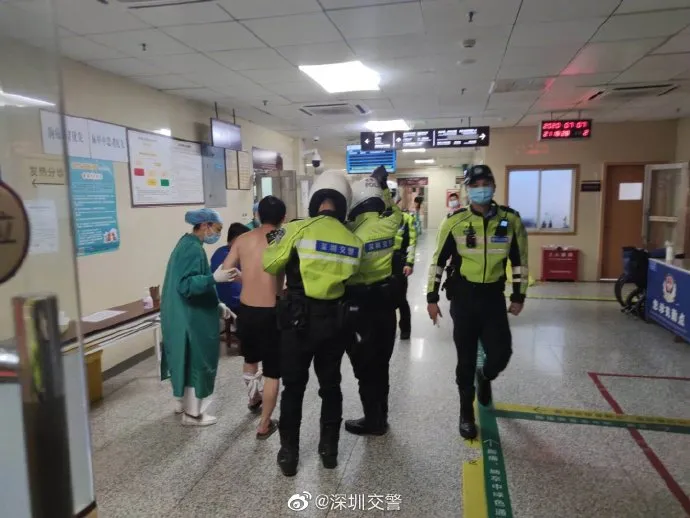 鐵騎一路沿著南坪快速往彩田路行駛,到達梅林關(guān)的位置后,跟福田交警匯合,采取前面開路后方護送的方式,花了15分鐘,就將病患護送到了市中醫(yī)院急診科。
