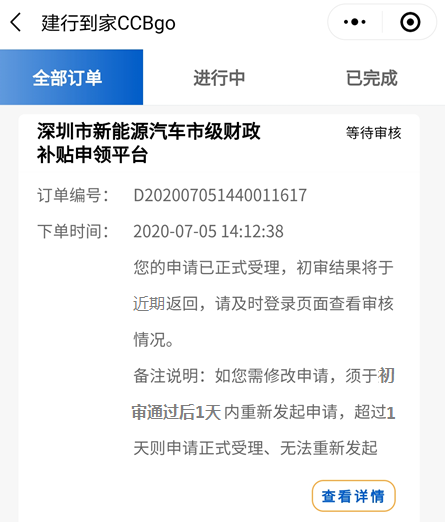客戶完成補(bǔ)貼申請(qǐng)?zhí)峤缓?,平臺(tái)將進(jìn)行首次初審,初審結(jié)果將于近期返回并通過短信方式告知客戶。屆時(shí),客戶可通過登錄“建行到家CCBgo-我的-我的申請(qǐng)”查看審核進(jìn)展。