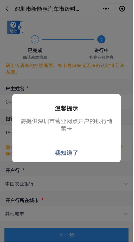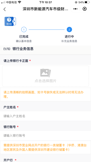 客戶需上傳銀行卡照片,并填寫銀行賬號(hào)、開戶行信息。開戶行如不在選項(xiàng)范圍內(nèi)可選擇“其他”自填。其中,銀行賬號(hào)需為深圳市營(yíng)業(yè)網(wǎng)點(diǎn)開戶的銀行一類儲(chǔ)蓄卡,華僑、港澳臺(tái)地區(qū)居民及外國(guó)人需提供深圳市建設(shè)銀行一類儲(chǔ)蓄卡。