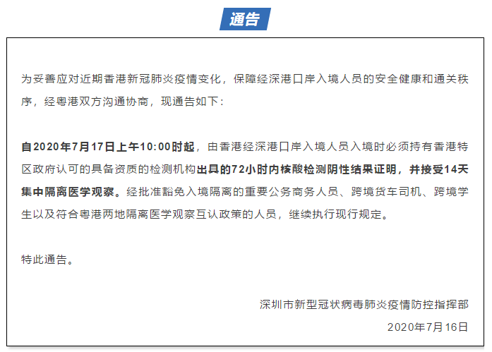 1、7月16日晚間,深圳市新型冠狀病毒肺炎疫情防控指揮部調(diào)整由香港經(jīng)深港口岸入境人員防控措施,由香港口岸入境人員須持72小時內(nèi)核酸檢測陰性結(jié)果證明,并接受14天集中隔離醫(yī)學(xué)觀察。