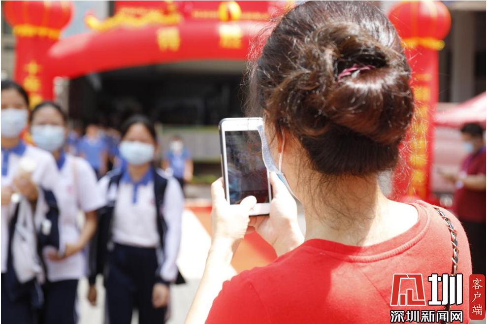 一位家長正在給走出考點的女兒拍照留念。