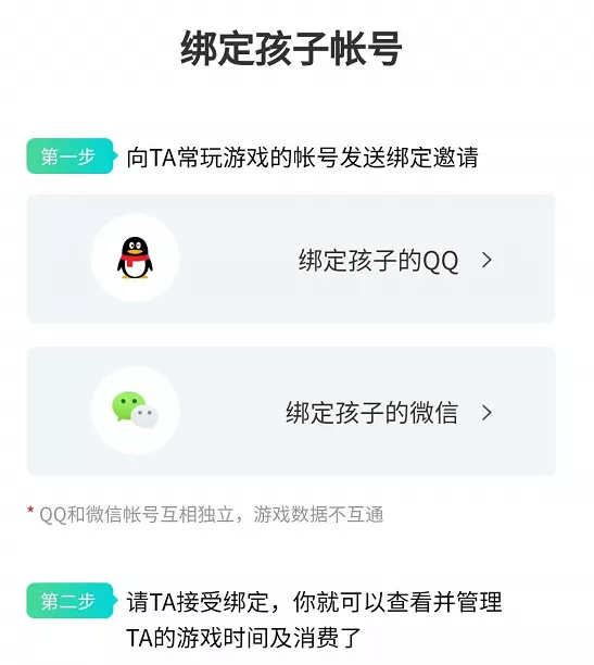 進入系統(tǒng)后,可以選擇你是家長還是孩子,比如選擇家長后,可以選擇孩子是用你的賬號玩還是他自己的賬號,如果是他自己的賬號,就可以向他常玩的賬號發(fā)送綁定申請,這里同時支持微信和QQ。